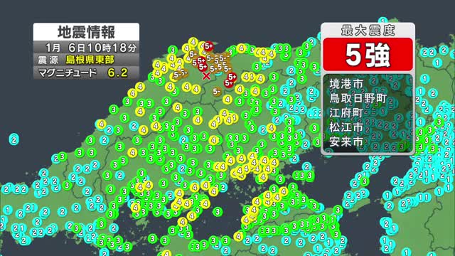 1月6日午前、鳥取県と島根県で最大震度5強を観測する地震が発生しました。岡山県と香川県の広い範囲でも震度4を観測しました。