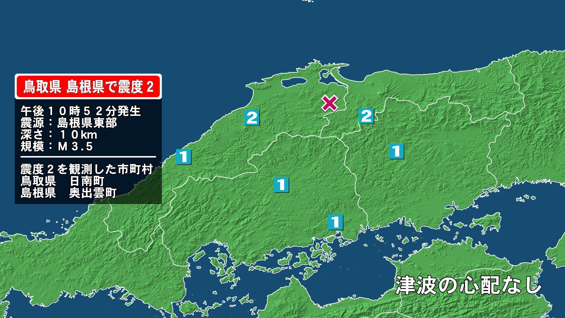 1月6日22時52分、島根県東部の深さ10キロメートルを震源とするマグニチュード3.5の地震があり、鳥取県日南町で最大震度2の地震が観測されました。