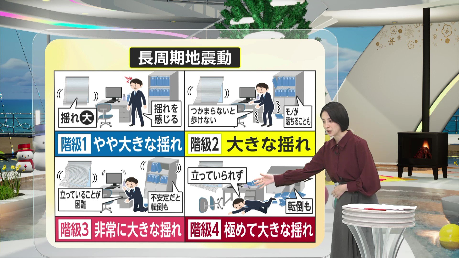 周期というのは揺れが1往復するのにかかる時間で、長周期は周期の長い揺れのことを指す。高いビルを長時間揺らすことや、遠くまで伝わりやすいといった特徴がある。2023年2月からは階級3、4が予測された場合にも緊急地震速報が発表されるということになっている。