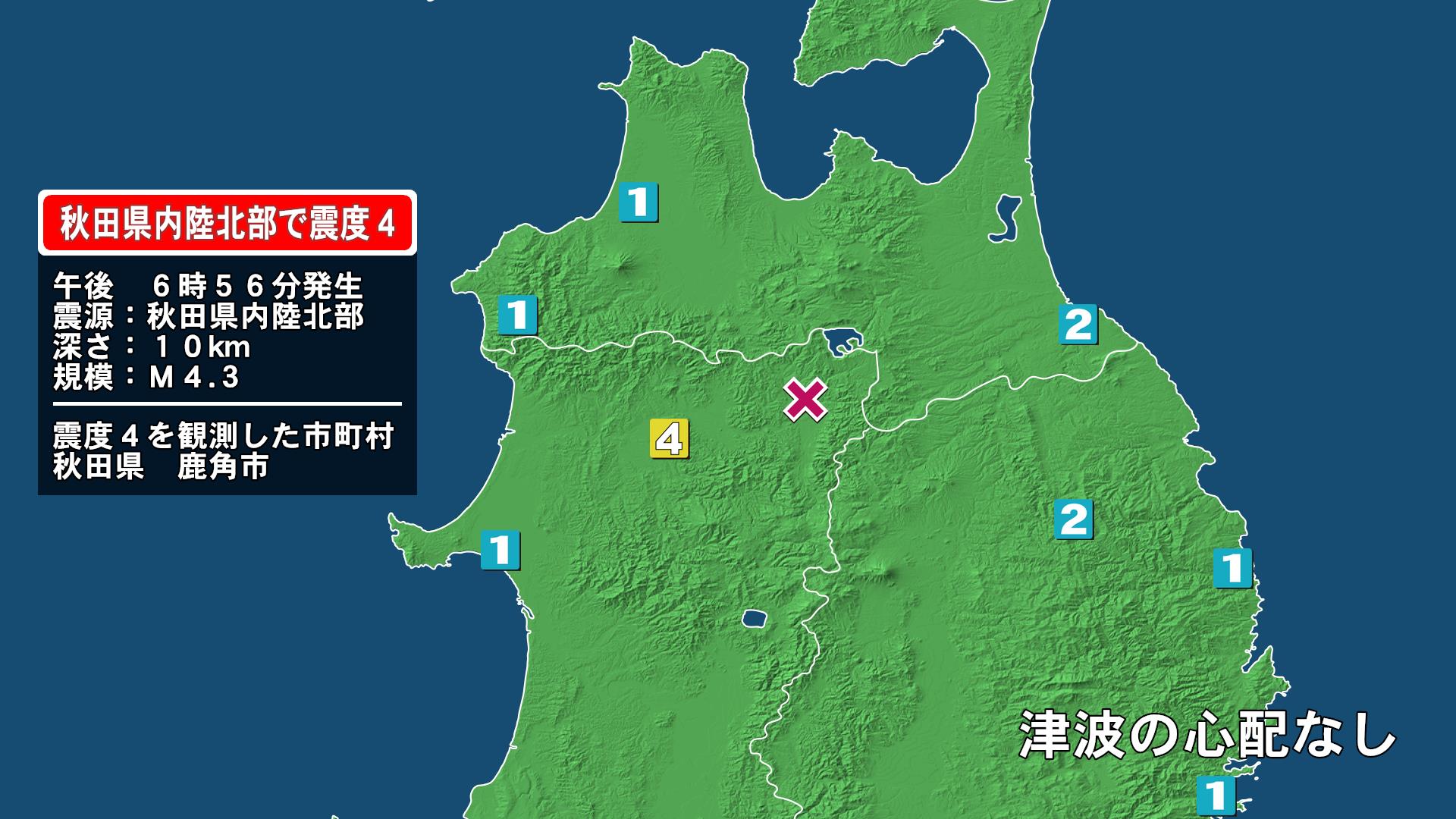 1月9日18時56分、秋田県内陸北部の深さ10キロメートルを震源とするマグニチュード4.3の地震があり、秋田県鹿角市で最大震度4の地震が観測されました。