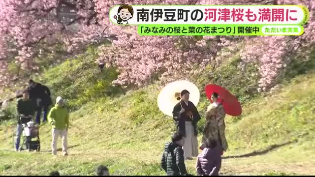 「みなみの桜と菜の花まつり」が開催されている南伊豆町から、河津桜の映像。青野川沿いに立ち並ぶおよそ800本の桜はいま満開を迎えています。青空も広がったきょうはウェディングフォトの撮影をする人たちの姿も見られました。そして風が強かった18日は所々で桜吹雪も。訪れた人たちは存分に春を満喫していました。