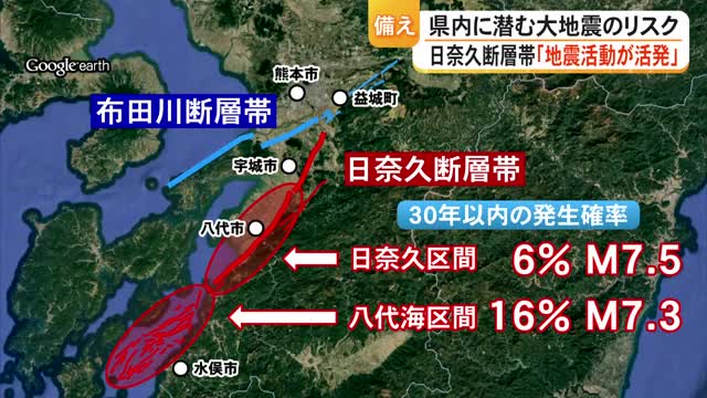 今後30年以内の地震発生確率は『日奈久区間』が6%、『八代海区間』が16%で、想定される地震の規模はマグニチュード7.3から7.5で、熊本地震の『本震』に匹敵します。