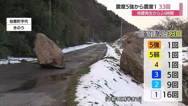 最大震度5強の地震の発生から24時間で、震度1以上の揺れはあわせて33回に上っていて、内訳は震度5強、5弱、4がそれぞれ1回、震度3が5回、震度2が9回、震度1が16回となっています。