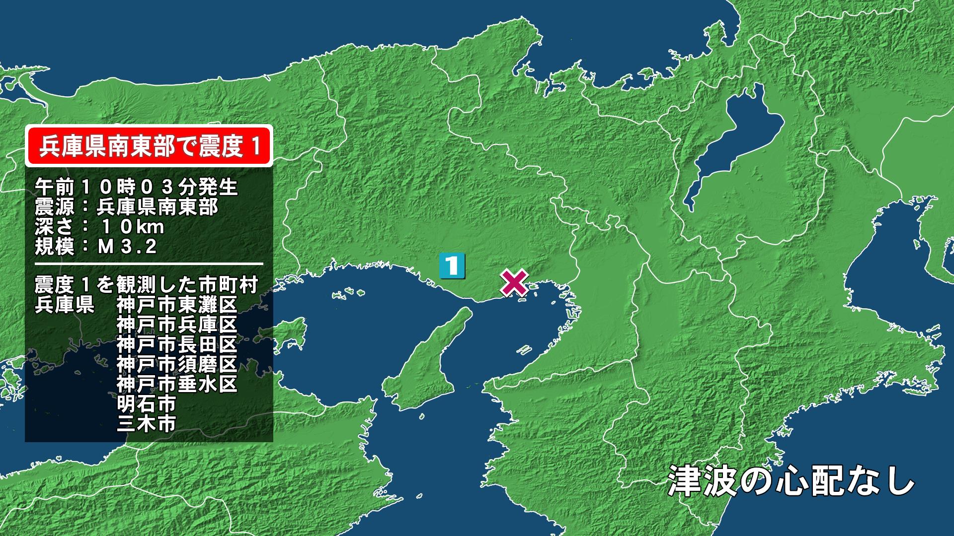 4月5日10時3分、兵庫県南東部の深さ10キロメートルを震源とするマグニチュード3.2の地震があり、兵庫県神戸東灘区で最大震度1の地震が観測されました。