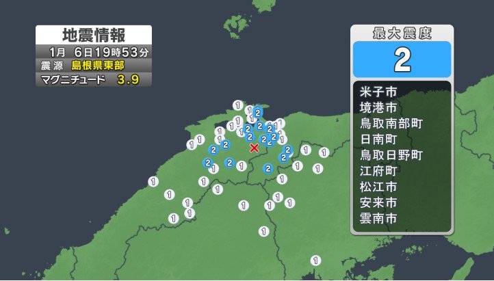 6日19時53分 震度1(鳥取県、島根県で震度2)